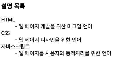 • <dl> 태그로 시작하고, <dt>는 설명할 용어, <dd>는 그 용어에 대한 설명을 작성